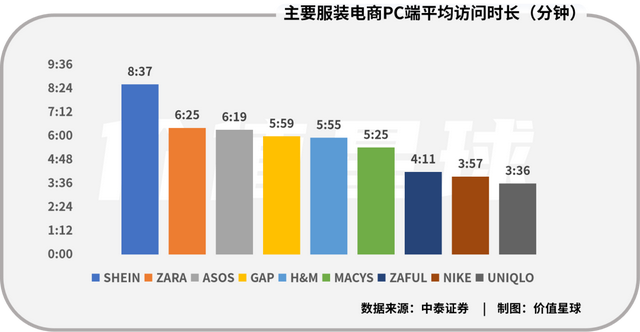 而且SHEIN的PC端十分让人“上瘾,中泰证券数据显示,在ZARA、H&M、GAP等一众对手中,SHEIN的PC端用户访问深度最强,访问时长达8:37分。