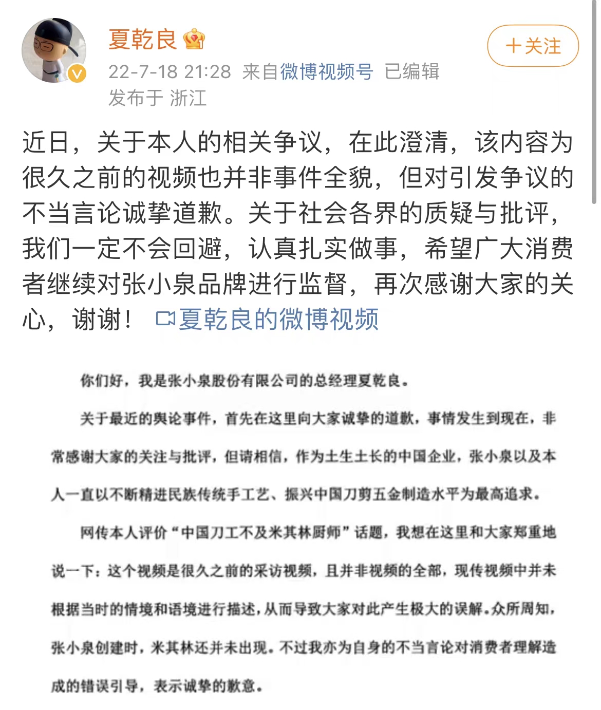 7月18日晚间,张小泉总经理夏乾良在个人账号发布视频就评价“中国刀工不及米其林厨师”致歉。