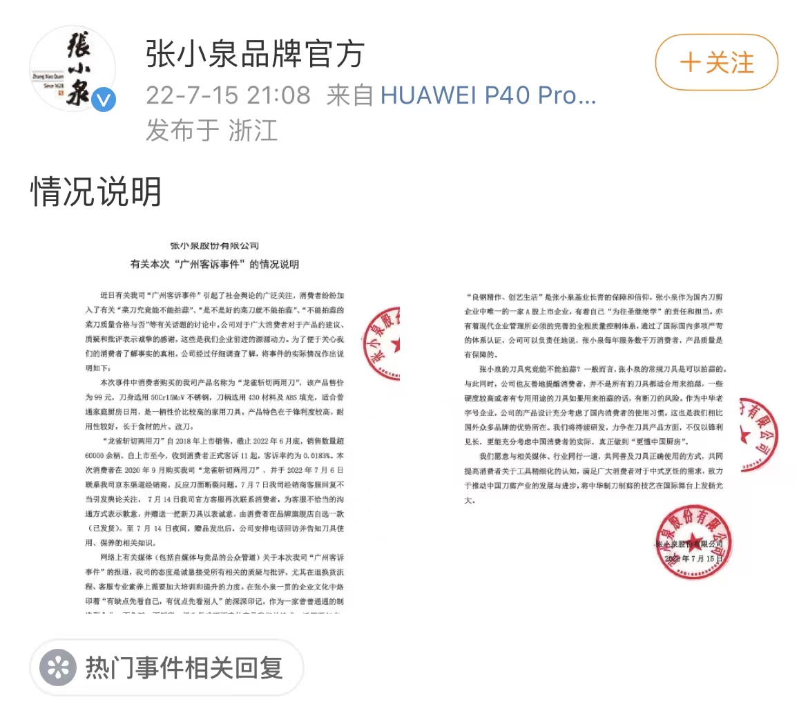 与张小泉相关的事件源于7月6日,有消费者在2020年9月购买张小泉的“龙雀斩切两用刀”,在用于拍蒜时菜刀断裂。该消费者于2022年7月6日联系张小泉京东渠道经销商,反映刀面断裂问题,经销商客服回复“菜刀不能拍蒜”。
