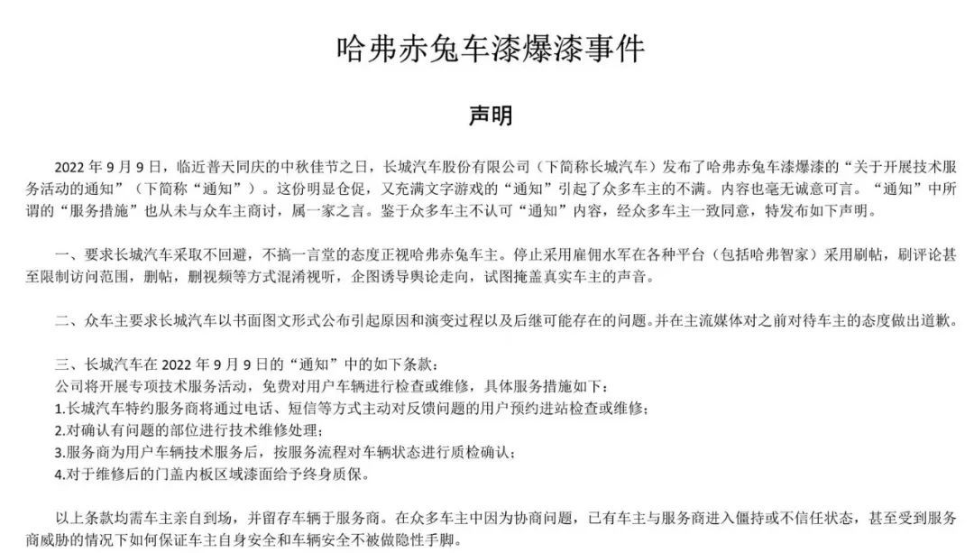 然而对于这种处理方式,不少车主认为漆面问题导致车辆二手价值受损,厂家应该进行赔偿。并且联合发布了《哈弗赤兔车漆爆漆事件声明》,提出了相应诉求。不过截至发稿,长城、哈弗等方面并未对此声明做出回复。