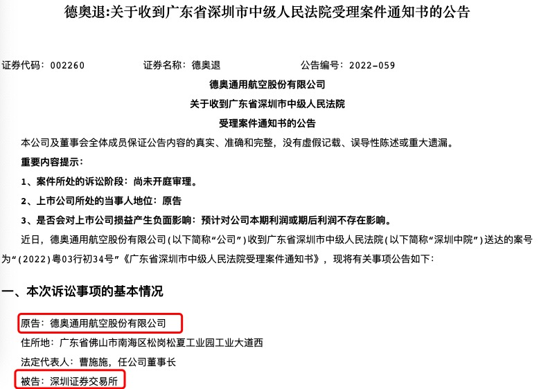 同日,公司表示目前已收到广东省深圳市中级人民法院送达的《受理案件通知书》,公司请求判令撤销深交所作出的《关于不同意德奥通航股票恢复上市申请的决定》,判令深交所停止对德奥通航股票终止上市自律监管决定的流程。