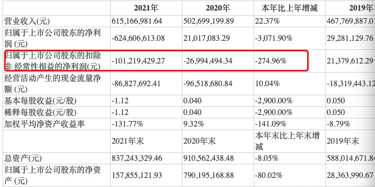 事实上,保荐机构终止保荐之外,公司业绩情况确实不符合恢复上市的标准。在深交所《股票上市规则(2018年11月修订)》中的“恢复上市”章节中,显示“最近一个会计年度经审计的扣除非经常性损益前后的净利润均为正值。”然而,公司2020年-2021年的扣非后净利润均为负数,2021年净利润也巨亏6.25亿元。