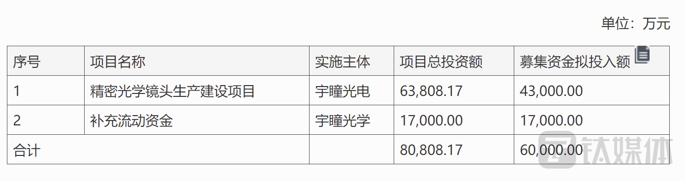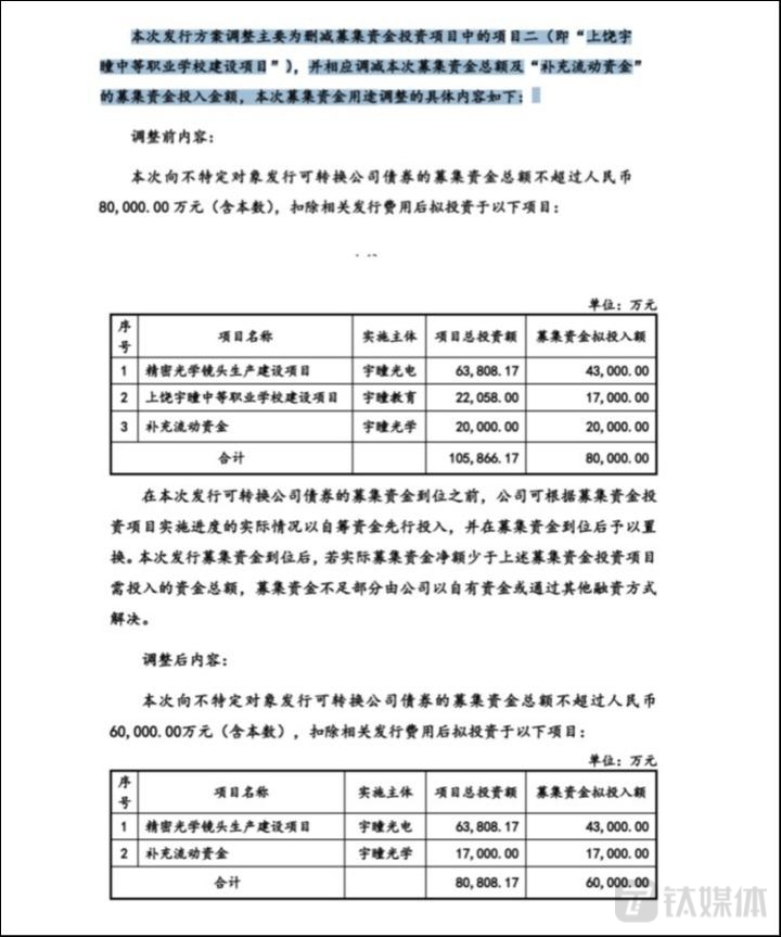 通过对比上述两次方案,钛媒体APP注意到,宇瞳光学将发行方案进行了调整,主要为删减上饶宇瞳中等职业建设中学建设项目,并相应调减本次募集资金总额,将此前募资金额8亿调整为6亿,补流项目投入金额由此前的2亿变更为1.7亿元。