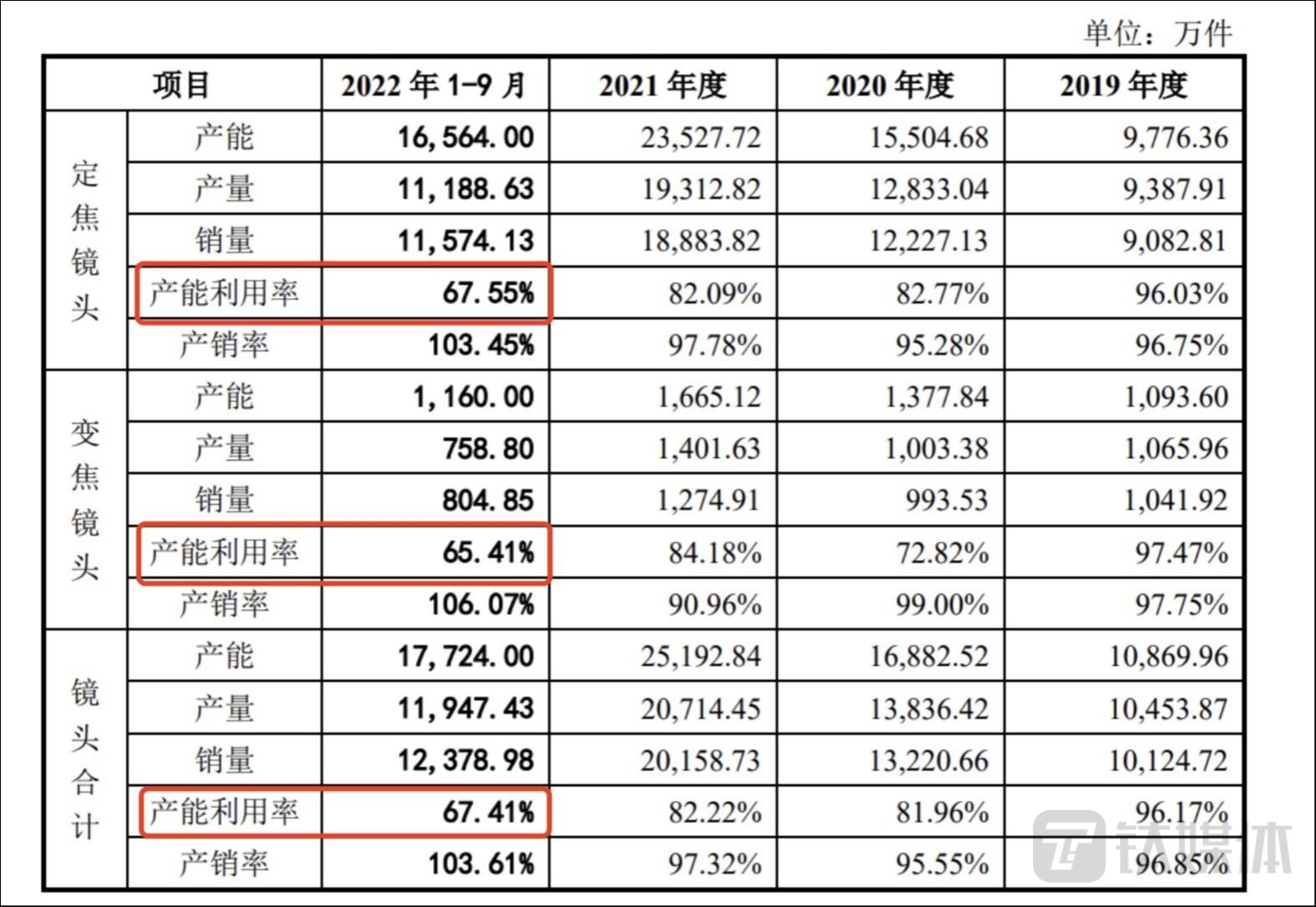 在2022年8月宇瞳光学的募集说明书,公司表示精密光学镜头生产建设项目不仅是对光学镜头产品进行投产建设,从而完善公司产品结构、提高产品附加值,该项目不属于拓展新业务、新产品。随后深交所针对该项目提出疑问,指出宇瞳光学的产能利用率低,要求说明该项目是否存在产能消化风险。具体来看,截止2022年三季度,宇瞳光学在定焦镜头及变焦镜头的产能利用率不到68%,公司称受疫情影响,导致产能利用率有所下滑。