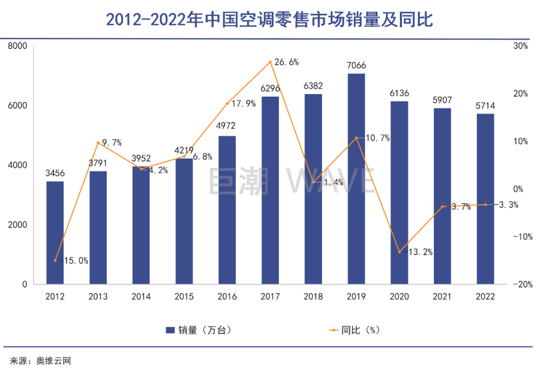 2020年起,地产严调控叠加疫情爆发,空调行业遭遇三连降。奥维云网数据显示,2022年我国空调零售销量5714万台,仅有2019年最高峰时的81%。