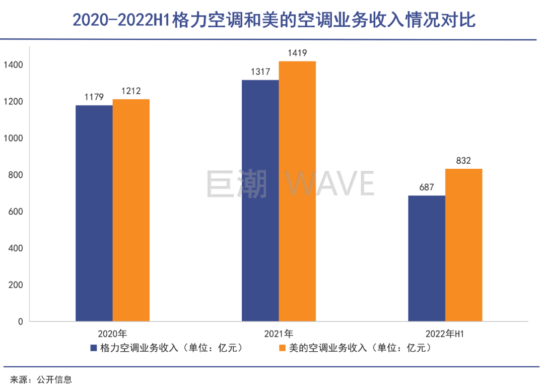 到了2022年上半年,格力空调收入687.46亿元,而美的达到了832.36亿元,差距拉大到145亿元。
