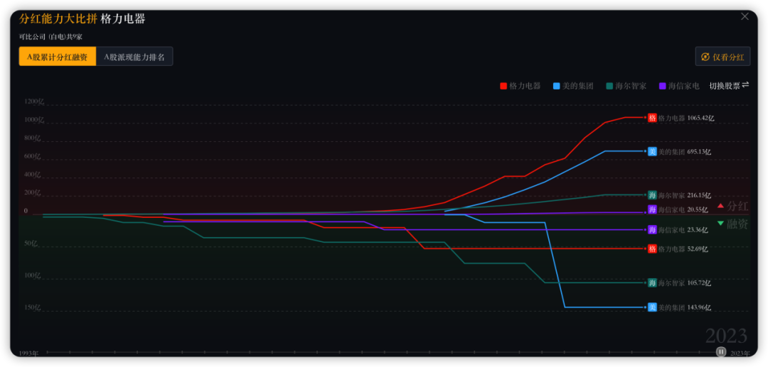 资本市场中,董明珠将格力价值股的特性推到极致,将其打造成了一家优秀的、成熟的高分红上市公司。这也是董明珠回击质疑最好用的武器,**“我从来没认为我失败,失败了这个企业不能给股民分红了。我们已经给股市分红1000多亿,但从股市只融资50亿元。”**