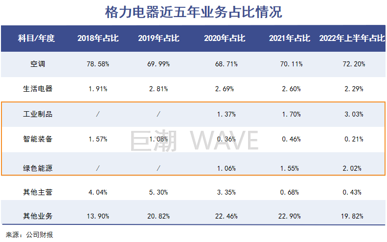空调之外,格力新品的拓展情况不佳——甚至可以用孱弱来形容。当美的、海尔的非空调业务带来上千亿营收时,格力甚至没能超过50亿(2021年年报数据)。