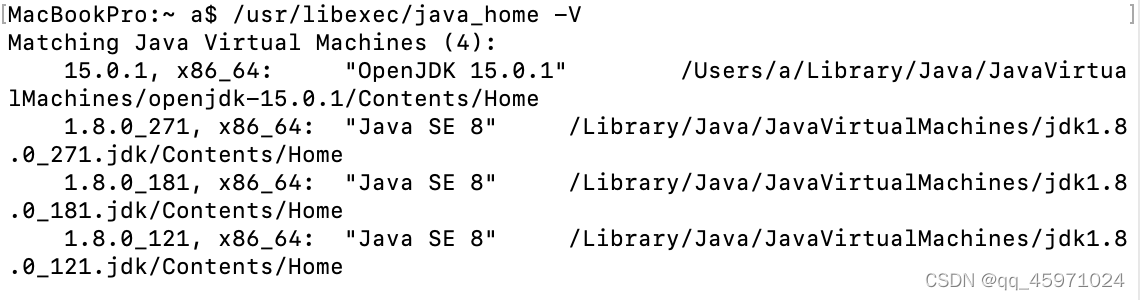1,查看自己mac中的jdk版本,java -version是查看自己电脑当前正在使用的jdk版本,输入 /us r/libexec/java_home -V ,如图所示: