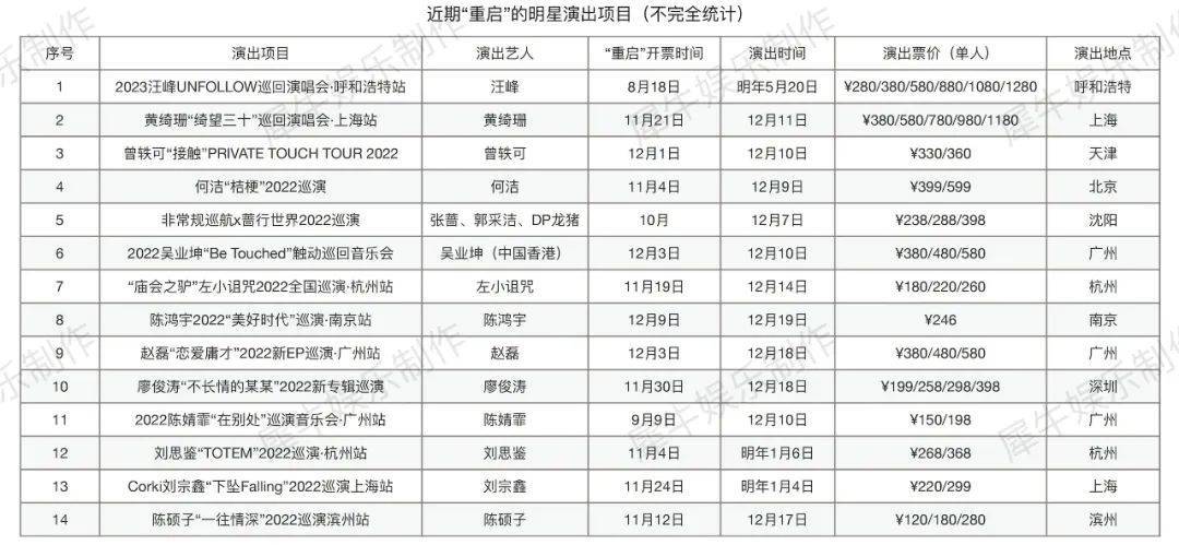不过,目前大部分“复工”演出规模普遍偏小,巨星拼盘式音乐节、超大型的头部歌手演唱会仍不见踪影。但可以想见的是,随着近来各地防疫政策的大幅调整,我们可以期待更大型的演出项目相继与我们见面。