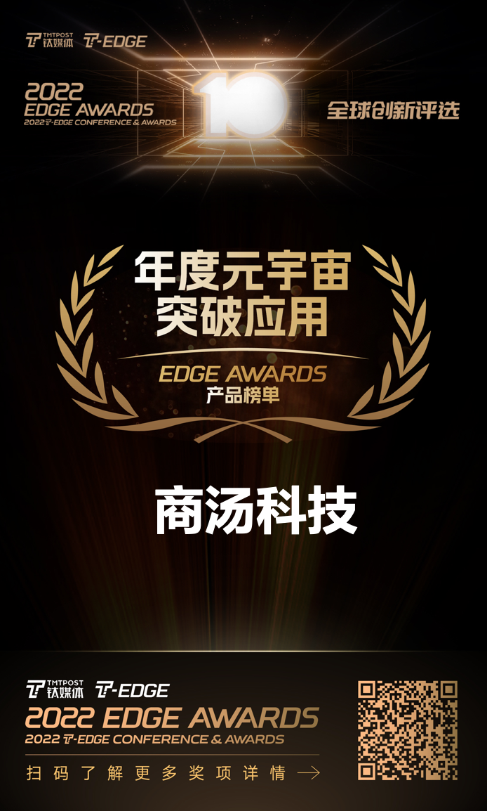 12月22日,钛媒体在每年一度的T-EDGE全球创新大会上,重磅发布了EDGE AWARDS各领域权威奖项。商汤科技荣获 “年度元宇宙突破应用”奖项,该奖项表彰在元宇宙生态技术领域做出卓越技术突破,多元化赋能元宇宙生态,为元宇宙世界与现实世界之间搭建更加简易方便的技术通道的优质应用。