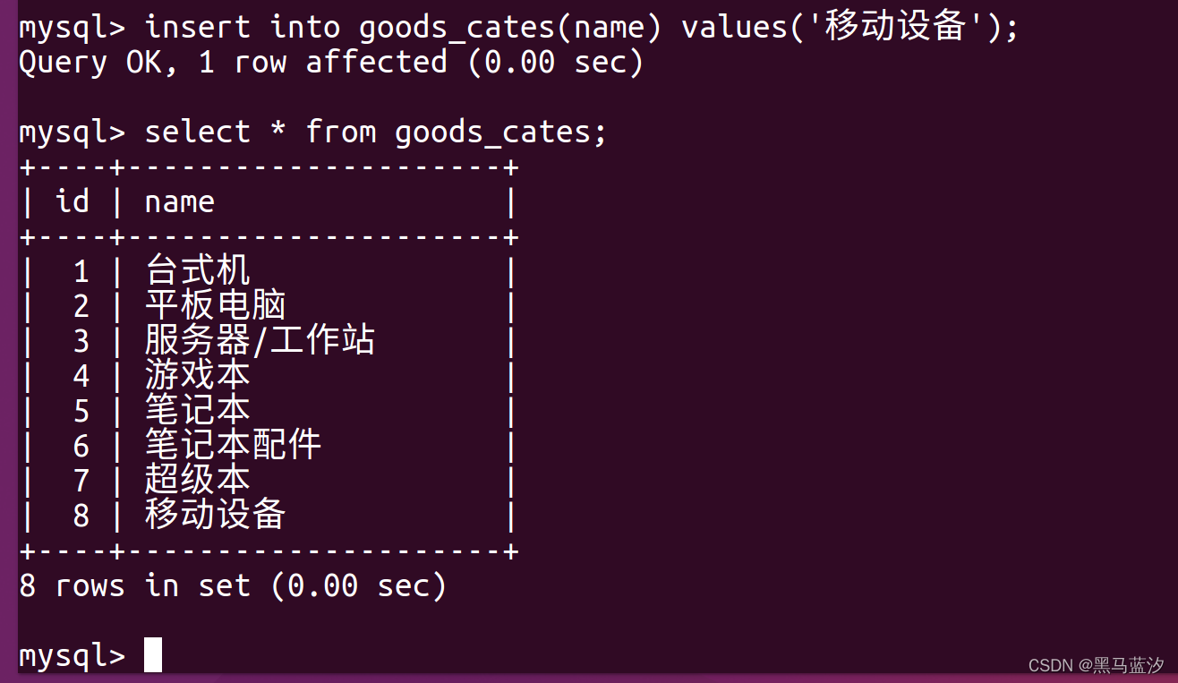目前只有一个goods表,我们想要增加一个商品分类信息(移动设备),只通过goods表无法完成商品分类的添加,那么如何实现添加商品分类信息的操作