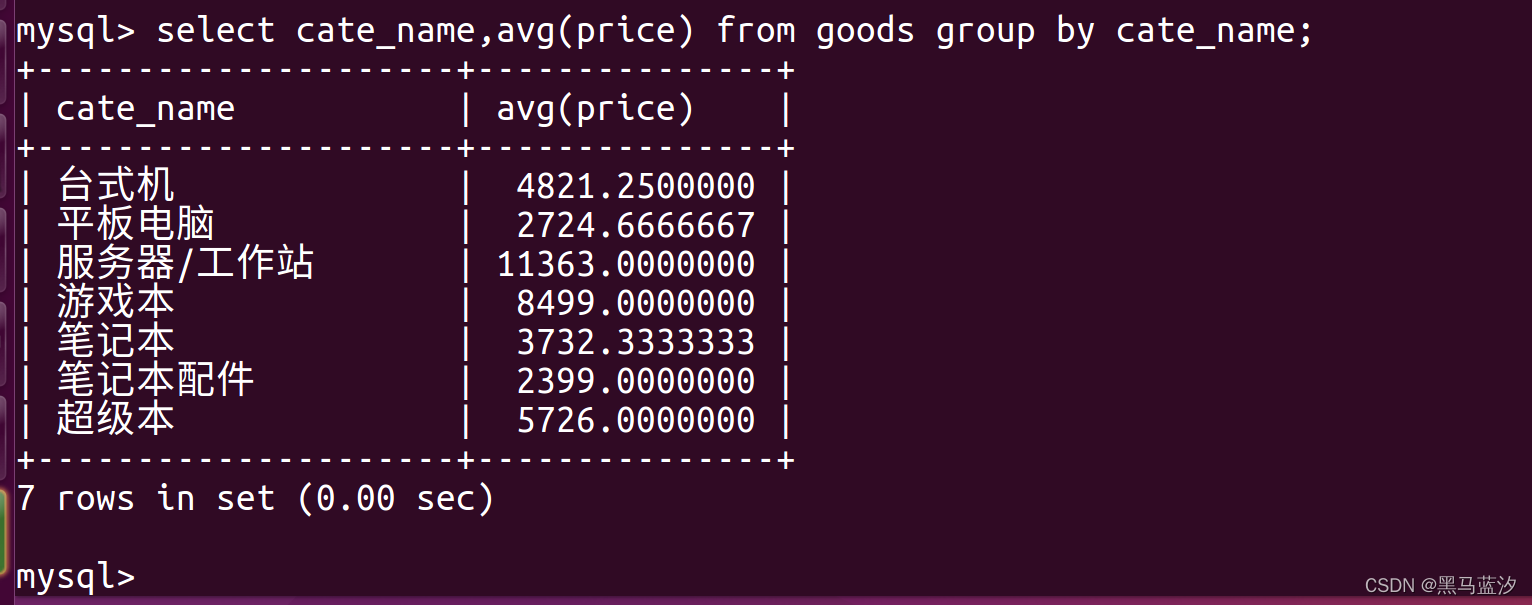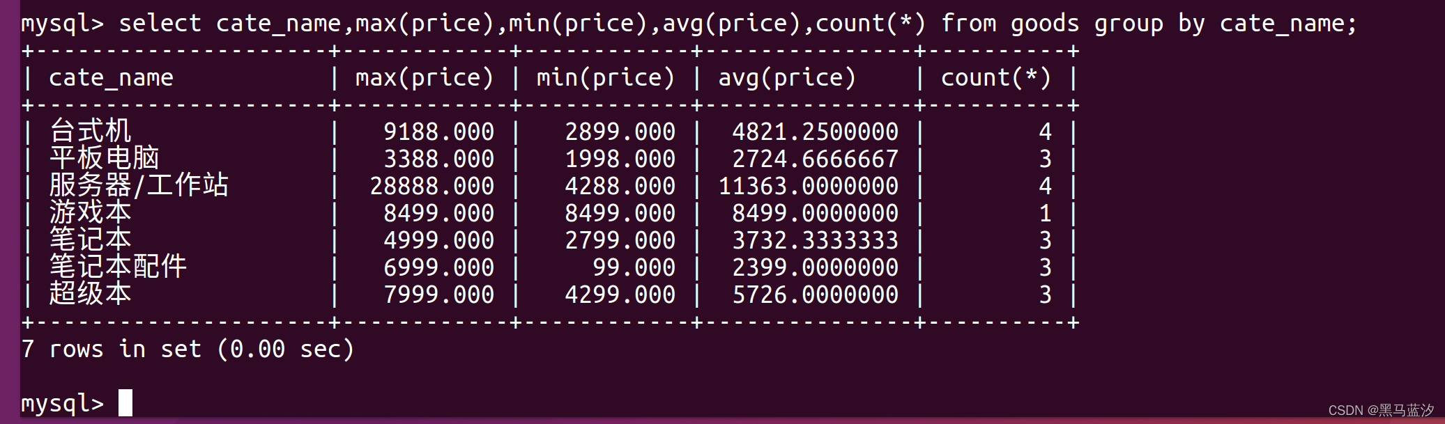 select cate_name,max(price),min(price),avg(price),count(*) from goods group by cate_name;