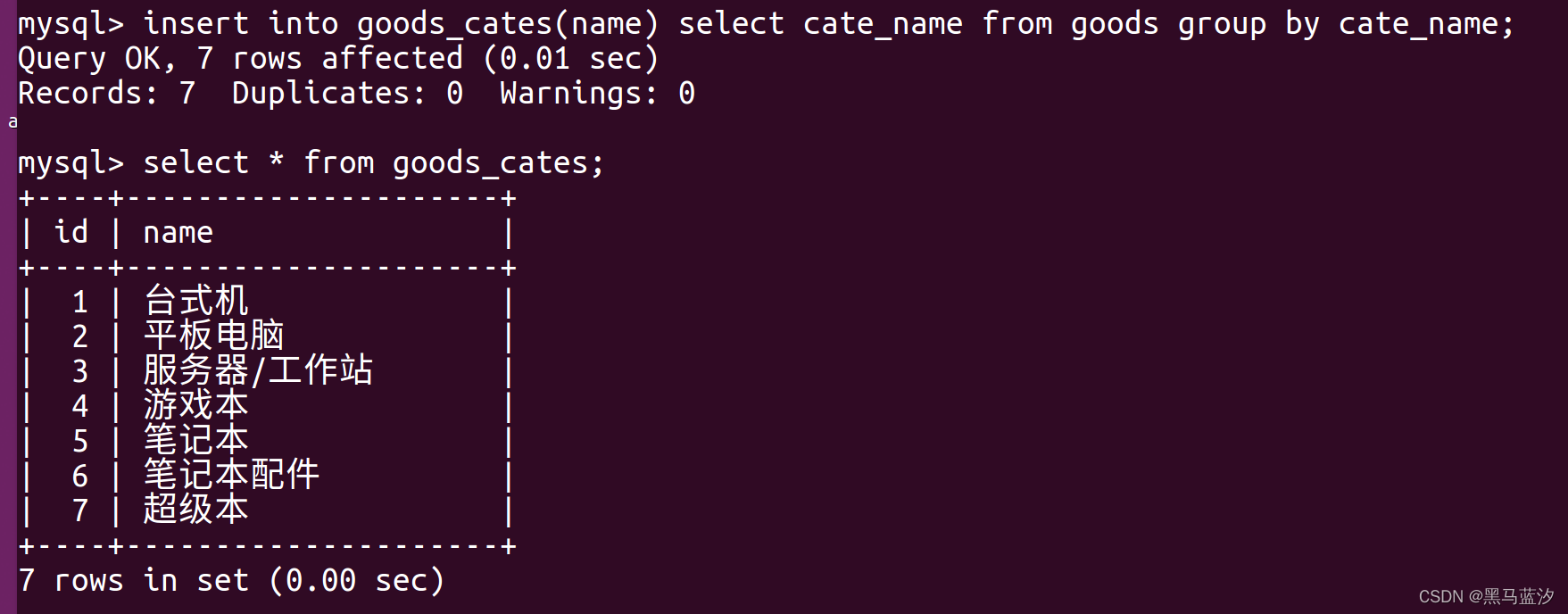 insert into goods_cates(name) select cate_name from goods group by cate_name;