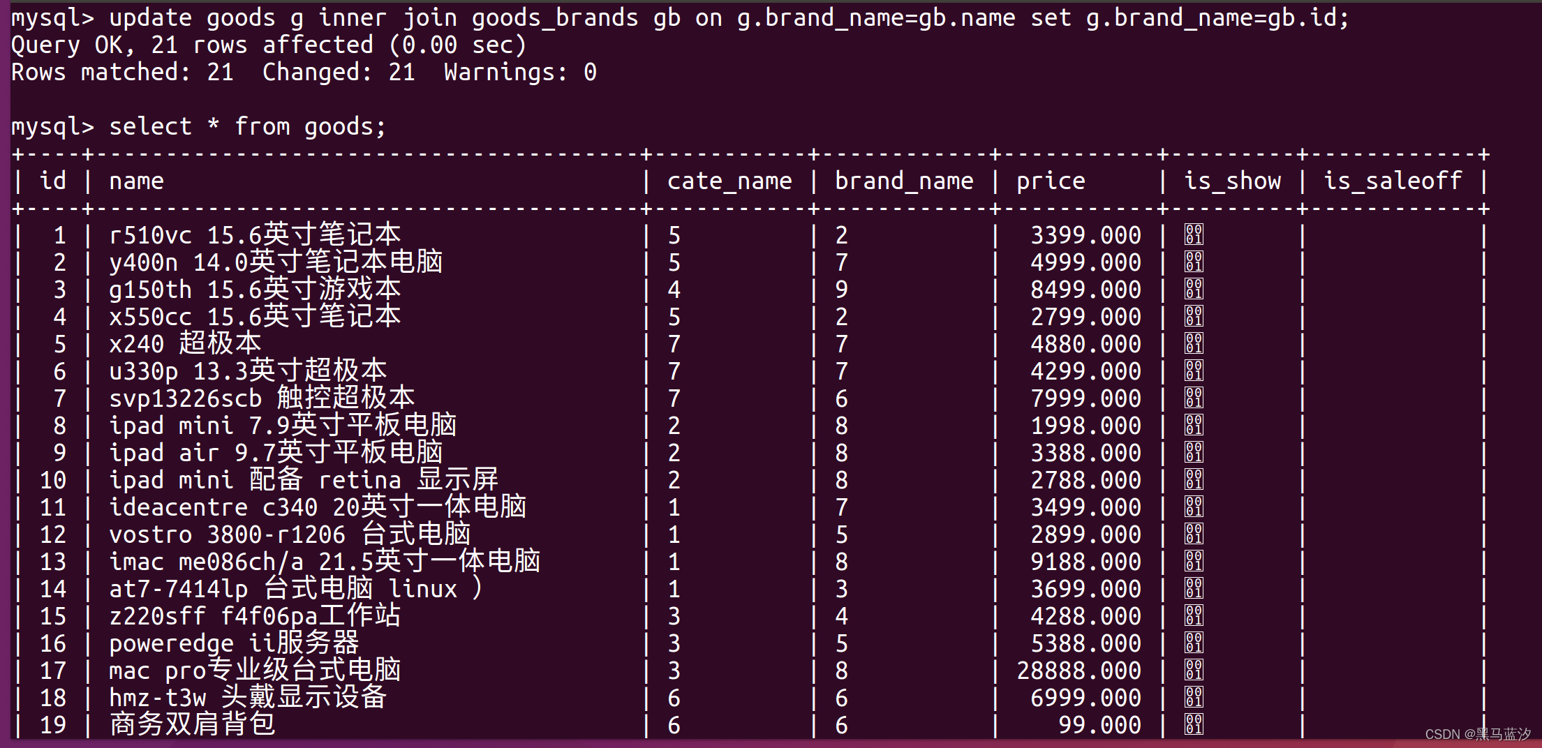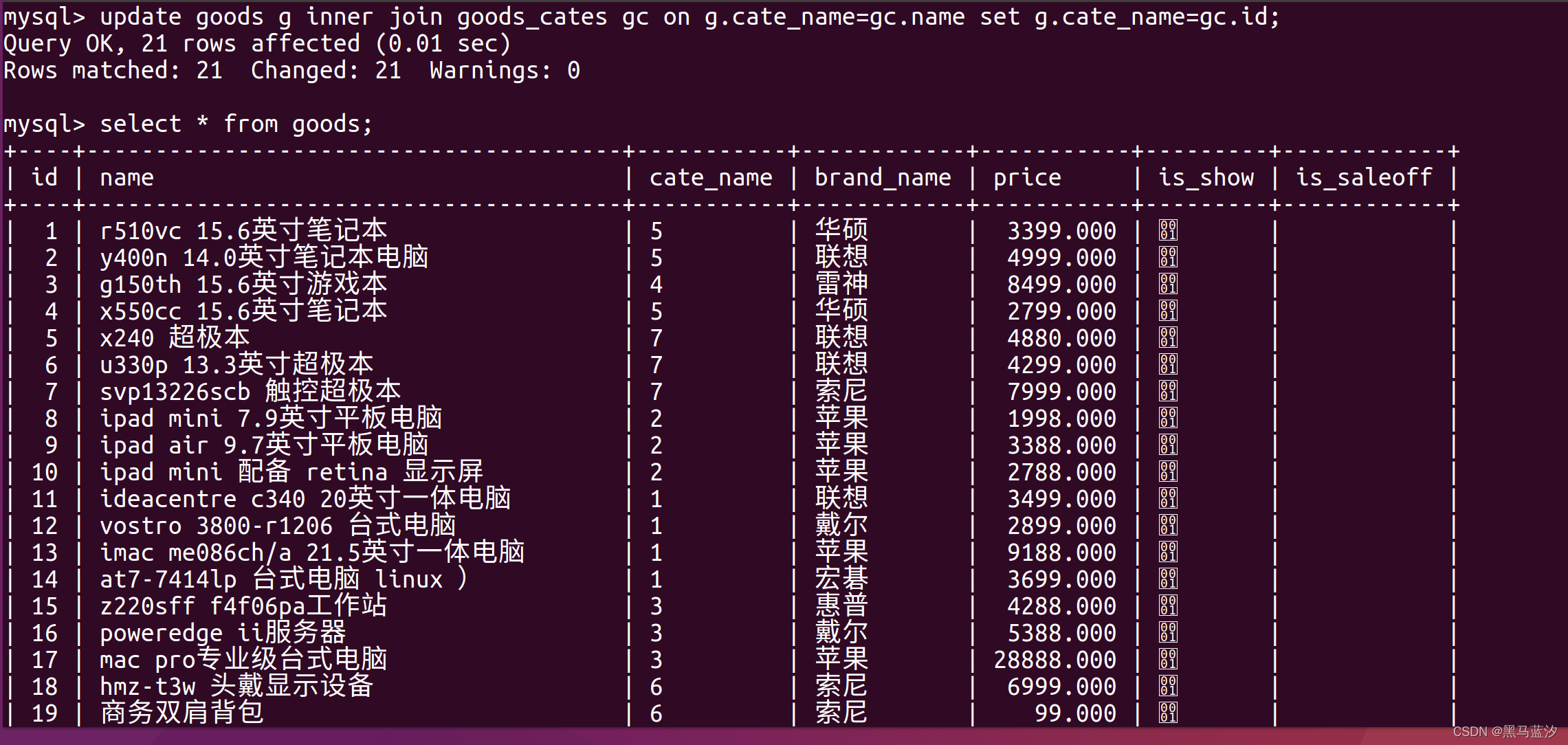 上面已经创建了一个商品分类表(goods_cates),并完成了商品分类信息的插入,现在需要更新goods表中的商品分类信息,把商品分类名称改成商品分类id