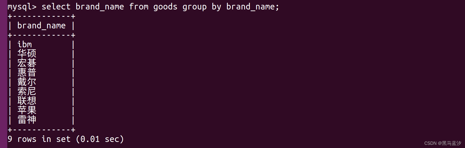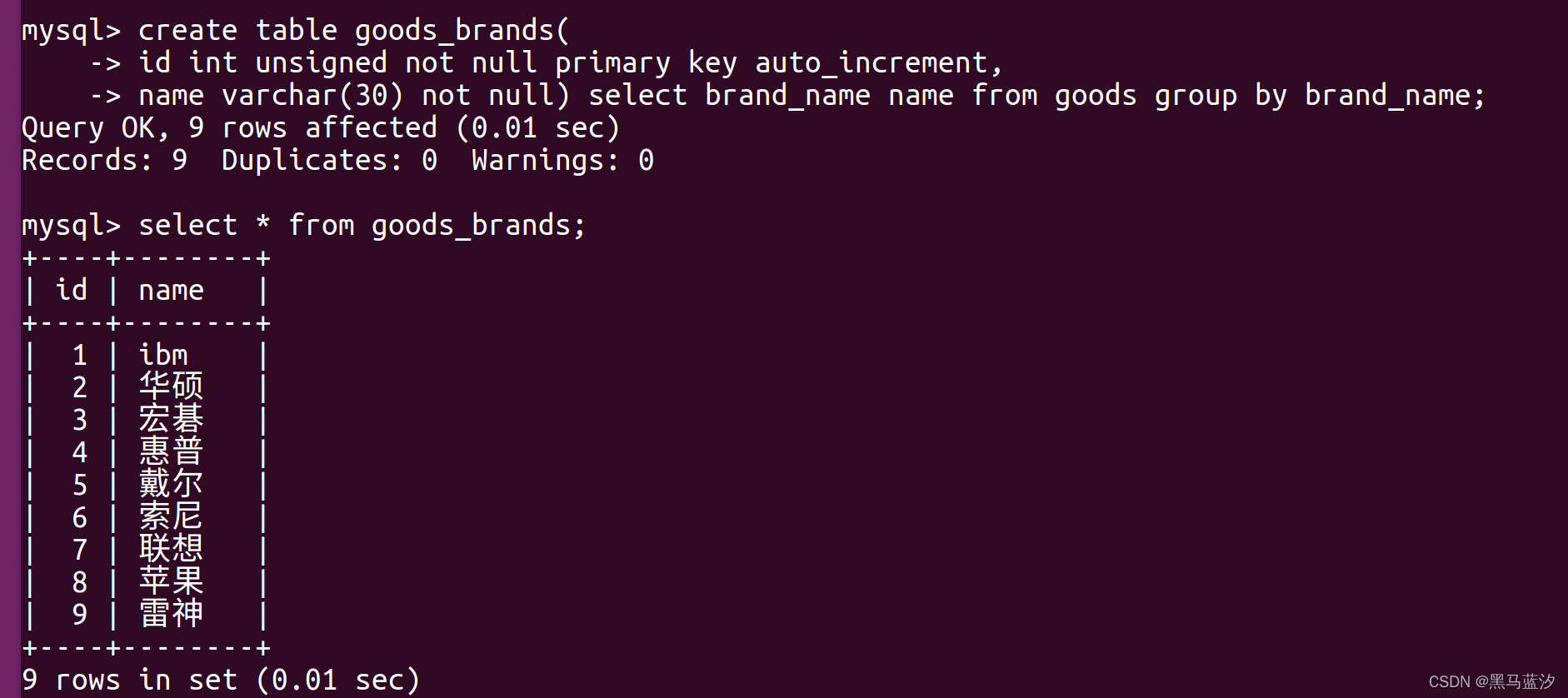 name varchar(30) not null) select brand_name name from goods group by brand_name;