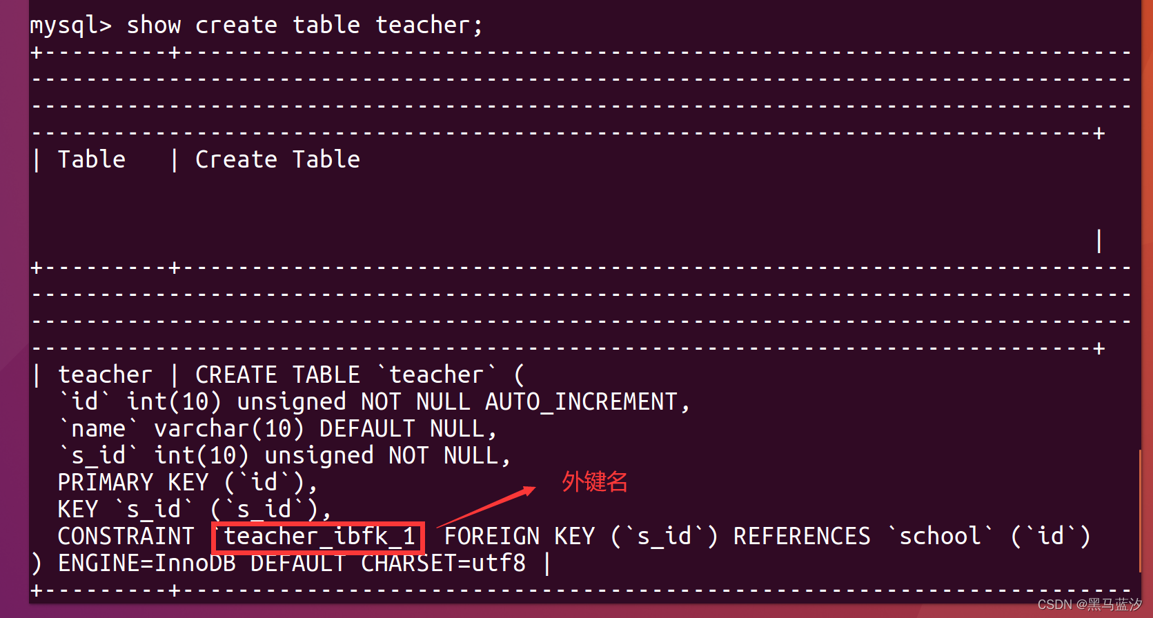 需要先获取外键约束名称,该名称系统会自动生成,可以通过查看表创建语句来获取名称