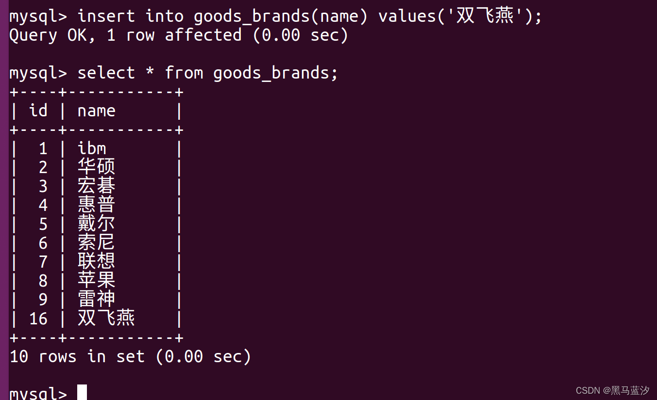 之前完成了商品分类表(goods_cates)的创建和商品分类信息的添加以及把商品表(goods)中的商品分类名称改成了对应商品分类id,如果我们还想添加一个品牌(双飞燕)品牌信息,只通过goods表无法完成品牌信息的添加,那么该如何添加品牌信息的操作