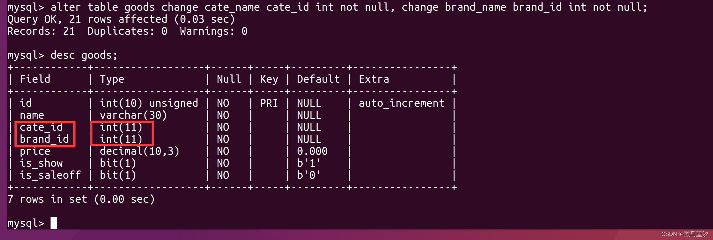alter table goods change cate_name cate_id int not null, change brand_name brand_id int not null;