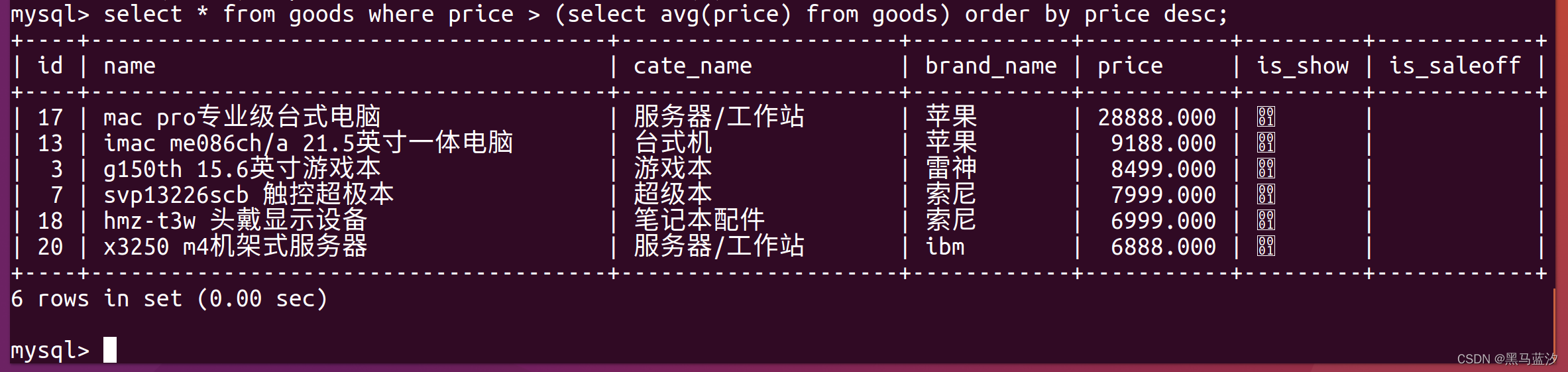 select * from goods where price > (select avg(price) from goods) order by price desc;