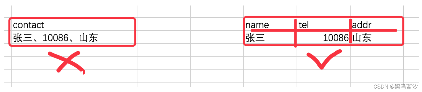 - 这种表结构的设计就没有达到1NF,要符合1NF需要把contact字段拆分开