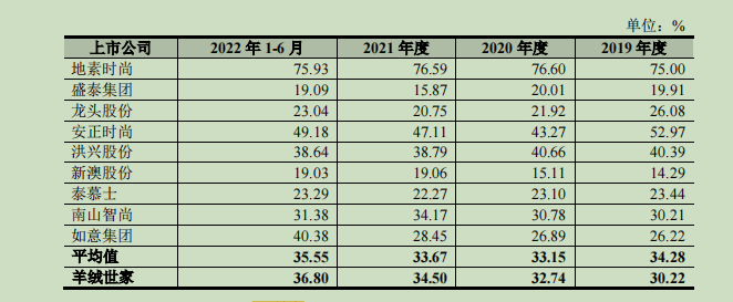 羊绒世家表示,公司产业链完整,自主品牌占比不断提升,所以公司整体毛利率水平也略有提升,与经营纺织与服装的可比公司相比,毛利率亦处于合理水平。