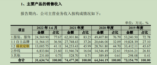 通过梳理招股书发现,羊绒世家的主营业务收入为服装、服饰,主要由自主品牌、成衣定制两大板块构成。从收入占比来看,羊绒世家的成衣定制的收入高于自主品牌。报告期内羊绒世家成衣定制的销售收入分别为33412.11万元、28761.8万元、34253.43万元、13005.75万元,占各期主营业务收入的比例分别为45.67%、44.7%、45.99%、41.11%。