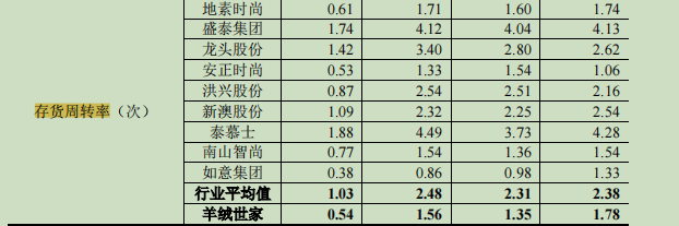 此外,羊绒世家的存货周转率低于行业均值。报告期内,羊绒世家的存货周转率分别为1.78次、1.35次、1.56次和0.54次,同期行业平均值分别为2.38、2.31、2.48和1.03。