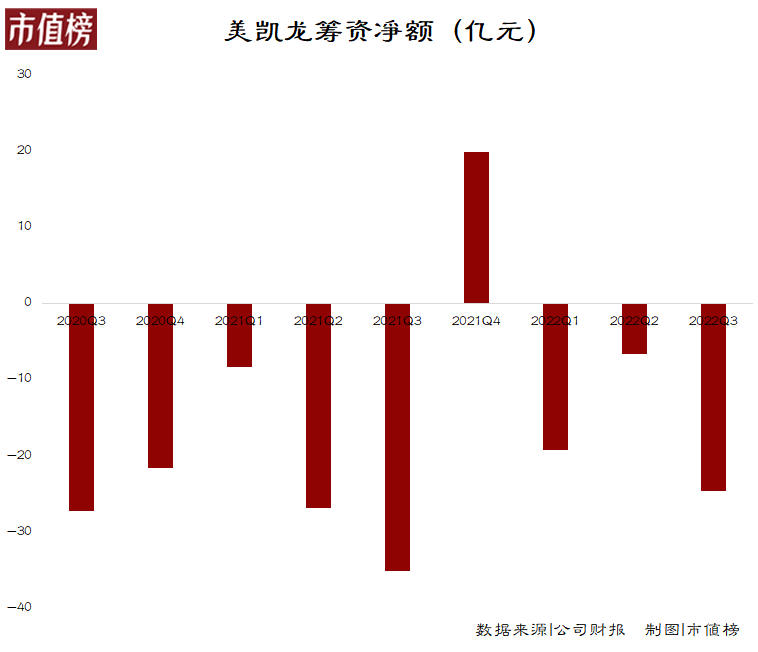 从2020年第三季度开始,美凯龙的筹资净额只有一个季度是净流入,其他时间都是流出状态。以2021年为例,当年的筹资活动现金净流出50.54亿元。