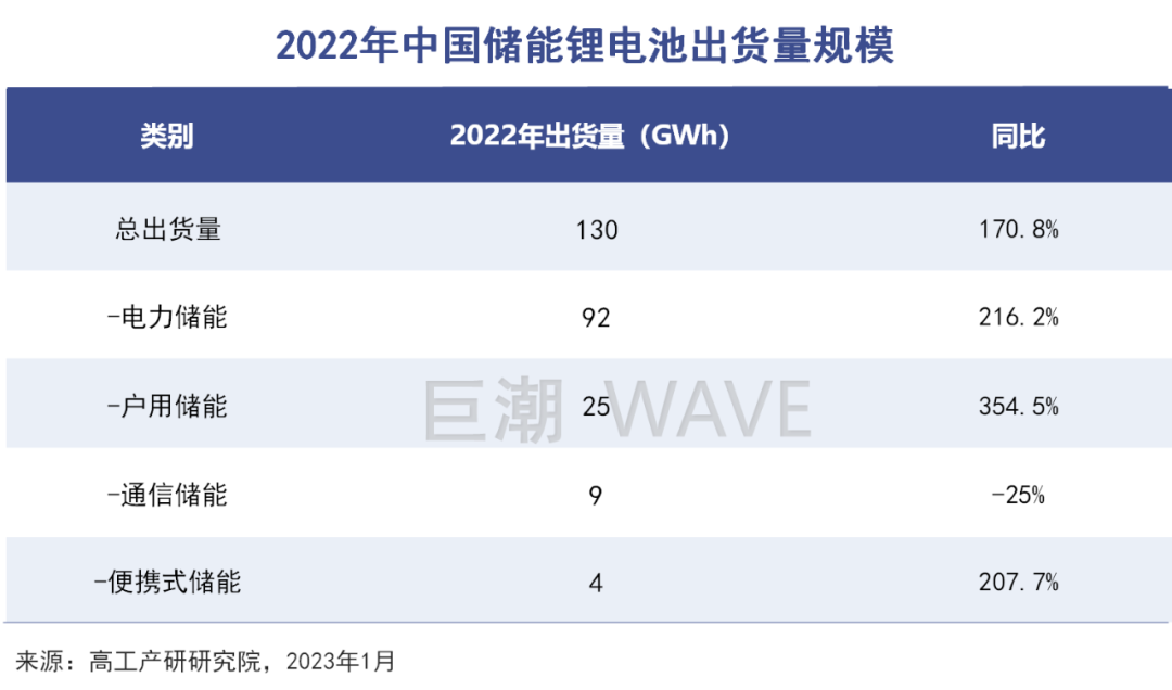 根据GGII最新调研数据统计,2022年国内储能锂电池出货量达到130GWh,同比增速达 170%。这其中,电力储能电池出货量为92GWh;户用储能电池出货量为25GWh;通信储能电池出货量为9GWh;便携式储能电池出货量为4GWh。