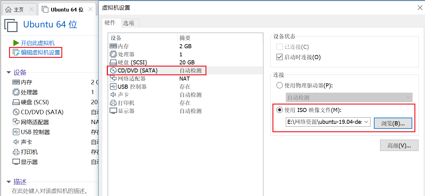 14.选择【编辑虚拟机设置】->【CD/DVD(SATA)】->【使用ISO映像(M)】,然后选择下载好的ubuntu20.04镜像文件。 (图片安装的是Ubuntu19.04镜像,但是操作是一样的。有想要安装Ubuntu19.04的朋友,可以参考这篇文章。)
