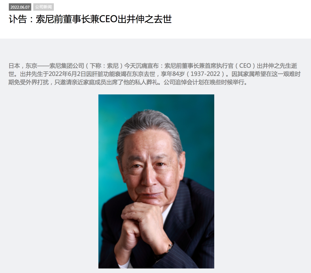 6月7日,索尼官网发布了一则讣告。讣告中称,索尼前董事长兼首席执行官(CEO)出井伸之先生于2022年6月2日因肝脏功能衰竭在东京去世,享年84岁(1937~2022)。