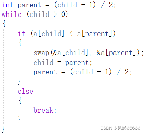 如上图,如果子节点数据比父节点数据大,两者就交换,且把父节点下标赋值给孩子,父节点下标为(child-1)/ 2,否则就直接跳出循环