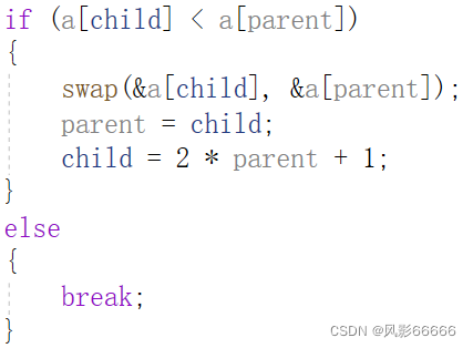 再判断孩子节点数据是否比父节点数据大,大就交换,且将孩子节点下标赋值给父节点,孩子节点为2 * parent + 1,否则就跳出循环