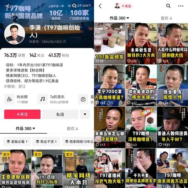 现在,作为T97咖啡的创始人,李潇将自己的抖音ID上也带上了“T97咖啡创始人”的字样,其视频内容也更多为创业鸡汤和T97生意经。