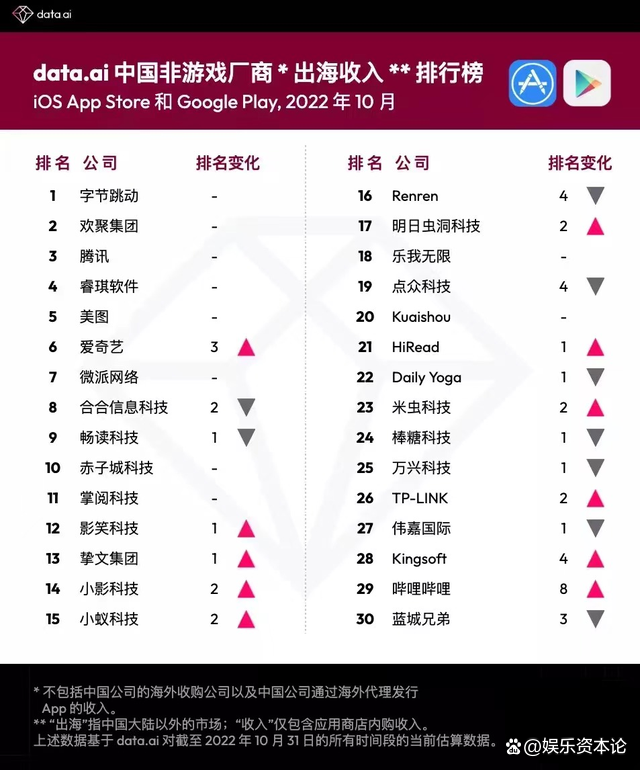 根据data.ai发布的一份中国非游戏厂商“出海收入”排行榜显示,在统计的30家中国出海公司中,陌陌海外收入排名第13。
