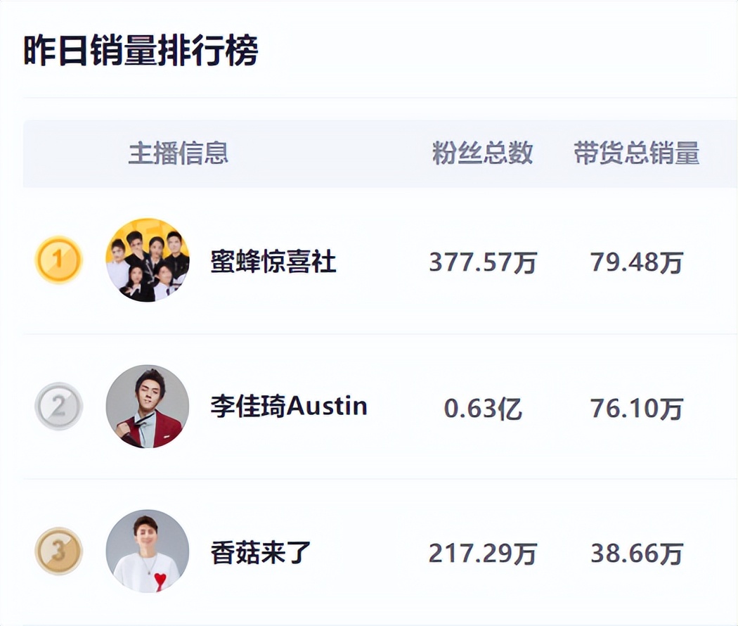 截止发稿前,当前,蜜蜂惊喜社的粉丝量为377万,香菇来了的粉丝量为217万,虽然体量远不及此前薇娅和雪梨的千万级流量,但是销量却不容忽视的优秀,本月以来,蜜蜂惊喜社更是以单日79万销售量超过了李佳琦。