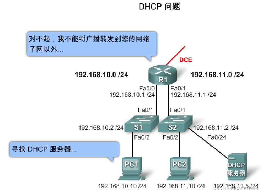 在中间路由器或者交换机上配置IOS帮助地址功能,该方案使路由器能够将客户端的DHCP广播转发给DHCP服务器。当路由器转发DHCP请求时,它充当的就是DHCP中继代理的角色。