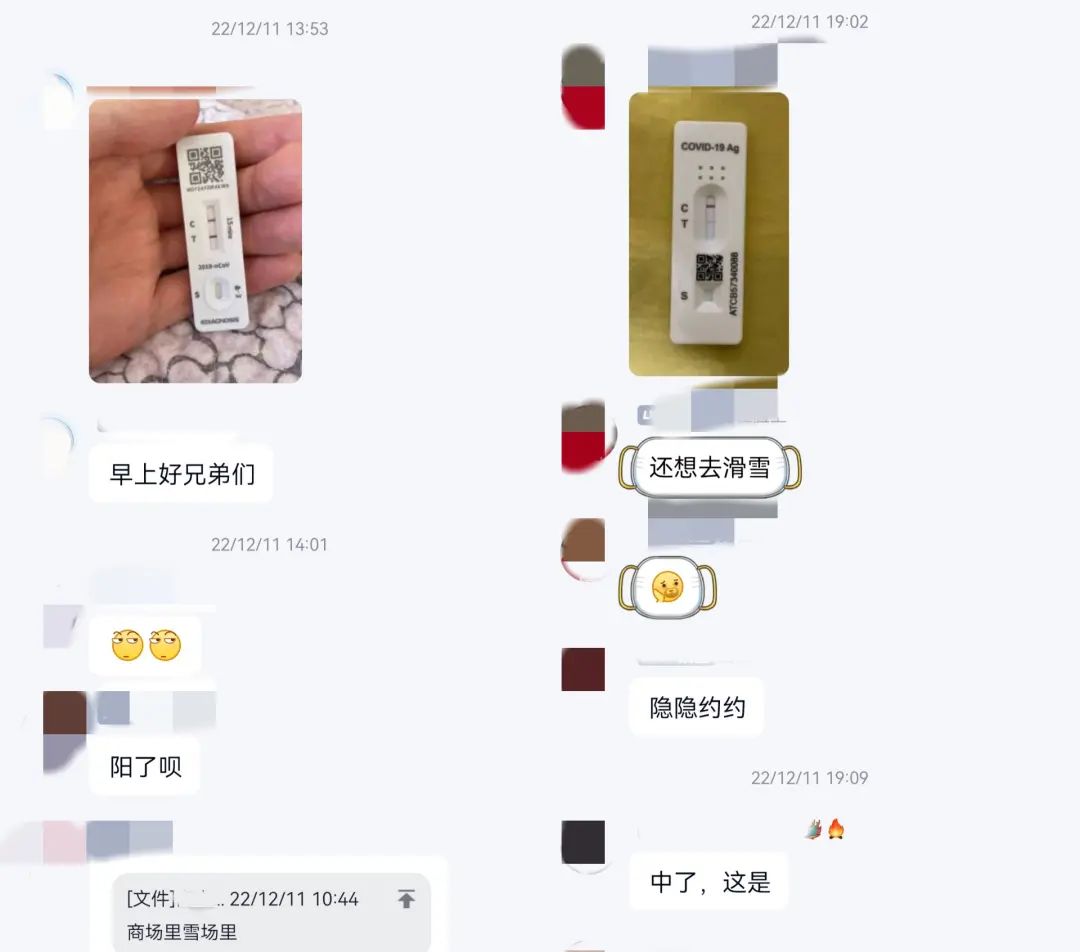 滑雪群中,11月还在讨论各地雪场防疫政策的雪友,在12月变成了“小阳人”,每天在群里互相询问“你阳了吗?”“你阳康了吗?”