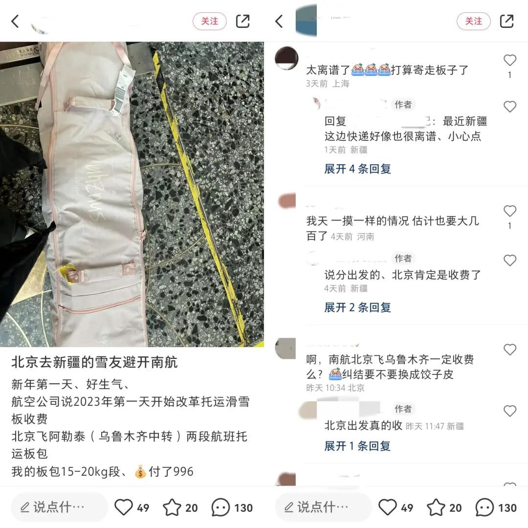 众多雪友只能选择随身携带雪具,但航空托运的价格也涨了不少。小红书上,有雪友表示自己乘坐南航从北京去阿勒泰的飞机,雪具托运就花了996元。