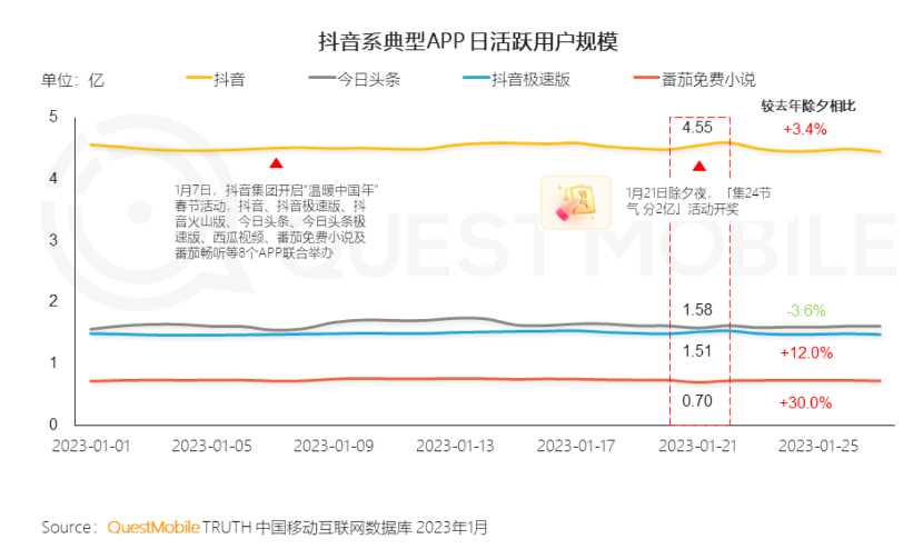在我们观察中,满足上述条件对于抖音都是比较困难的,根据Quest Mobile数据,2023年除夕抖音日活同比上年除夕增长3.4%,这其实也说明平台已经进入了成熟期。
