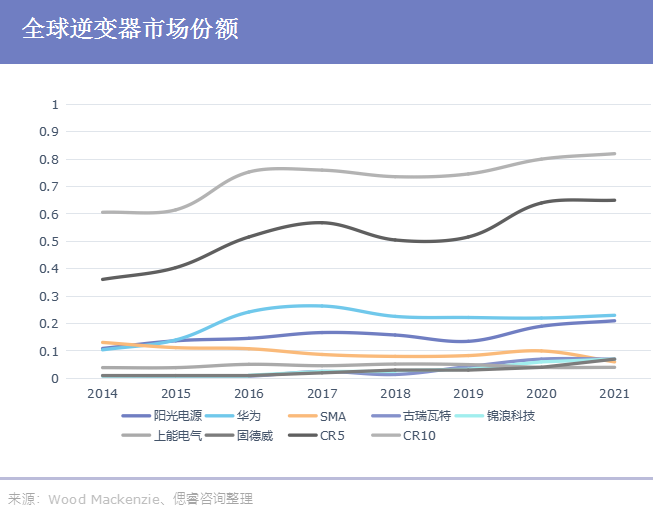 目前来看,全球逆变器市场集中度越来越高:从2014到2021年,CR10从60%提升到82%。华为、阳光电源连续7年领跑市场。