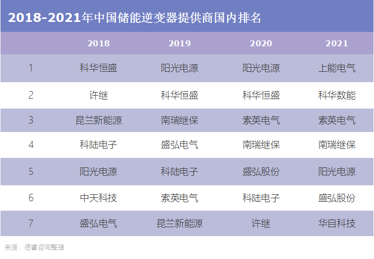 故头部的竞争还很激烈,前几名的地位每年都在轮换。其中变化幅度较大的是上能电气和阳光电源——阳光电源从2018年以来在第一名和第五名之间来回横跳,上能电气2021年突然冲到了第一名。