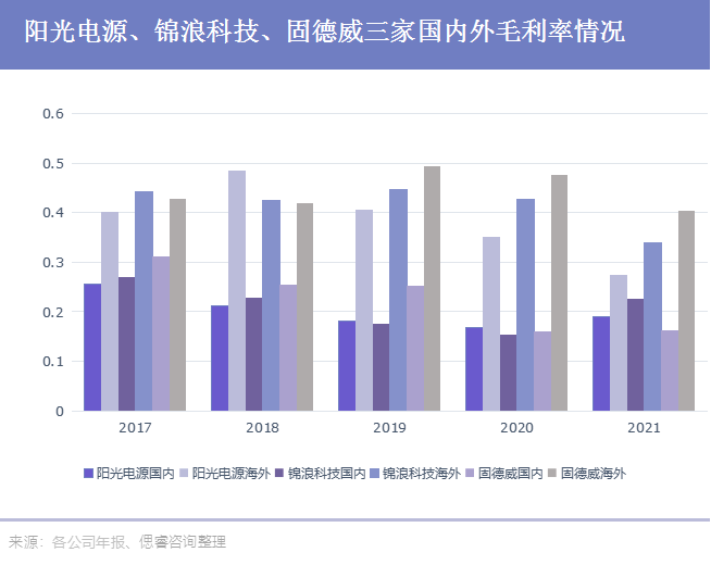 由于国外分布式市场技术壁垒高、渠道要求高,故海外市场的毛利率相对较高。