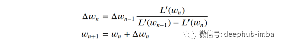 现在,为了把这些东西放在一起,给定以前的权重、以前的权重差以及以前和当前权重下的损失斜率,Quickprop只需通过以下方法计算新的权重: