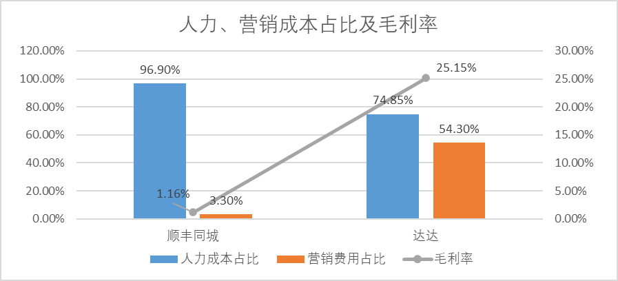 这说明业务量的增加并非是顺丰一家之功,而是行业方面的快速增长,这种以价换量的增长并不具备长期性。并且同样是打价格战,顺丰付出的远比四通一达高的多。 我们可以看到大打价格战后,顺丰引以为傲的毛利优势几乎已经不存在了,这次价格战对于顺丰来说可谓“赔了夫人又折兵”。