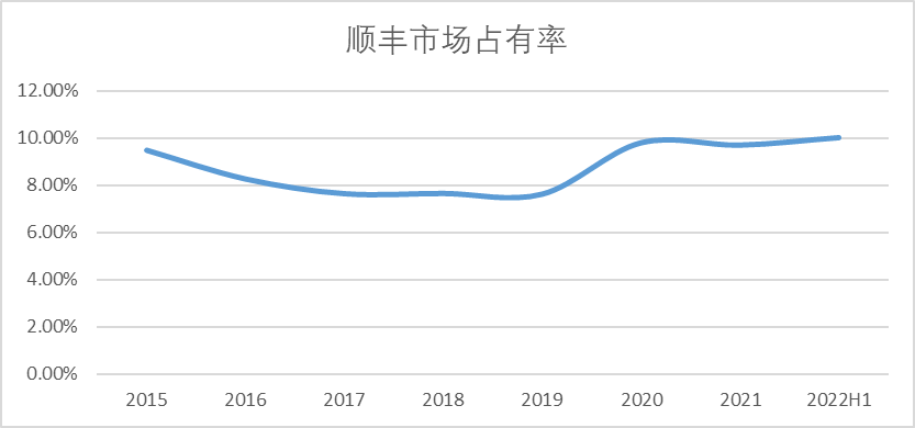 另一方面,因为各家快递公司抢占电商件市场纷纷下调产品定价,在一定程度上刺激了业务量快速增长, 表面来看顺丰2021年业务量增速非常明显,但是实际上在市场占有率层面却没有显著的增加,2021年市场占有率9.7%,反而低于2020年的9.8%,自2015年以来,市占率增长没有超过3% 。