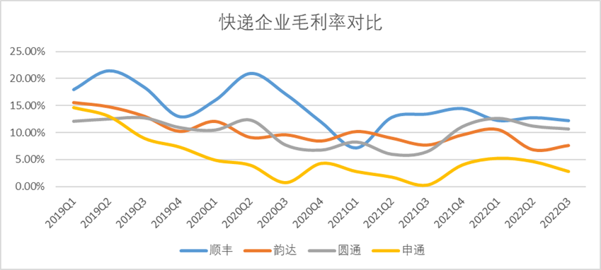 图:快递企业毛利率对比 图片来源:Choice金融客户端