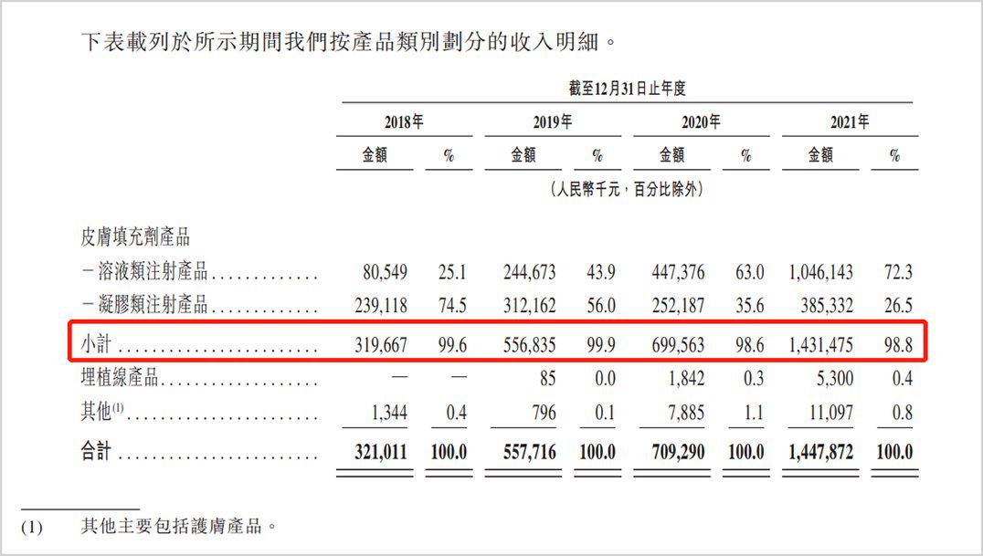 招股书数据显示,2018年-2021年,爱美客玻尿酸填充剂产品占公司总收入的比例高达99%,其余包括埋植线、护肤品等收入占比仅为1%。
