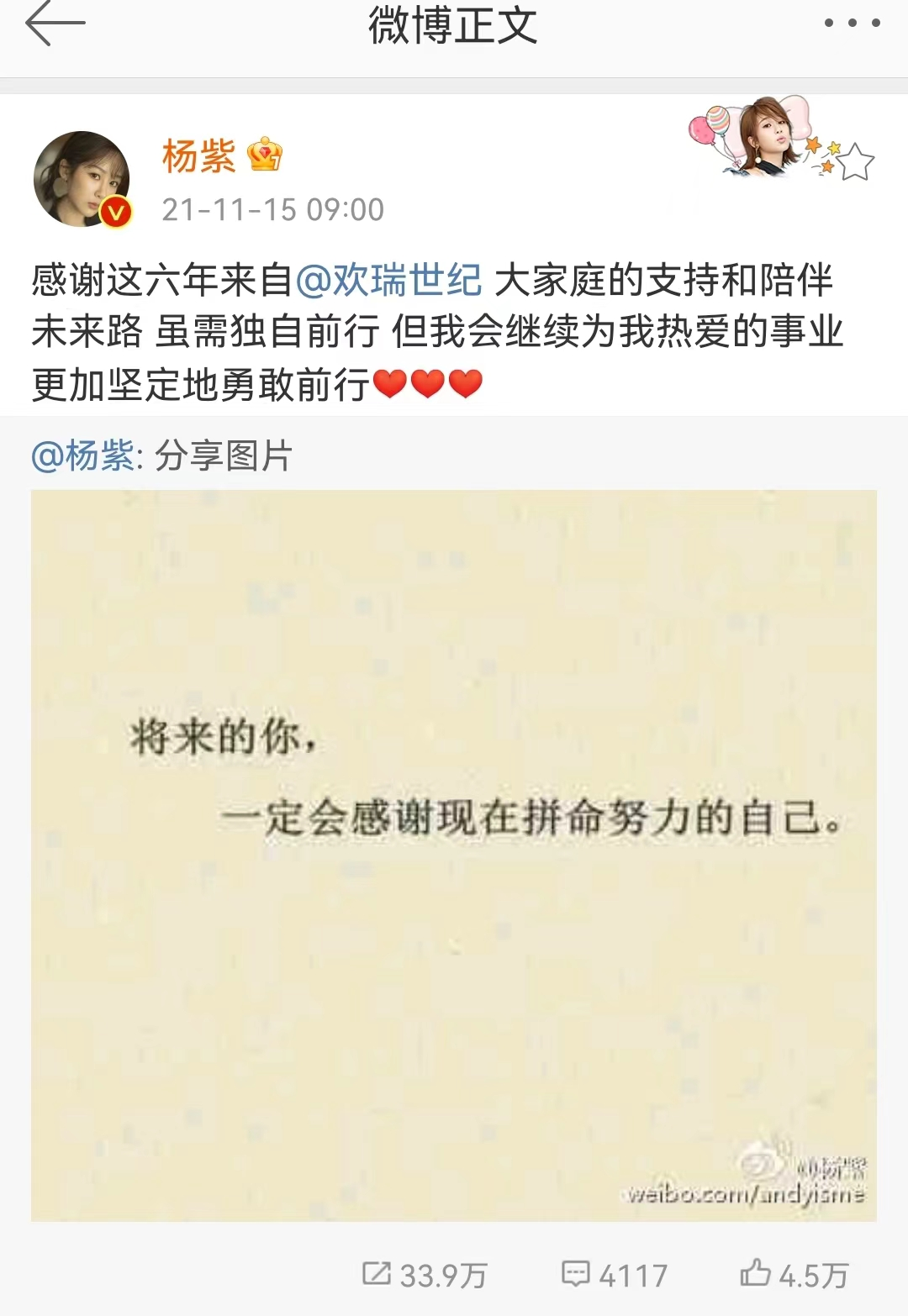 杨紫官宣与欢瑞合约到期,来源于杨紫微博